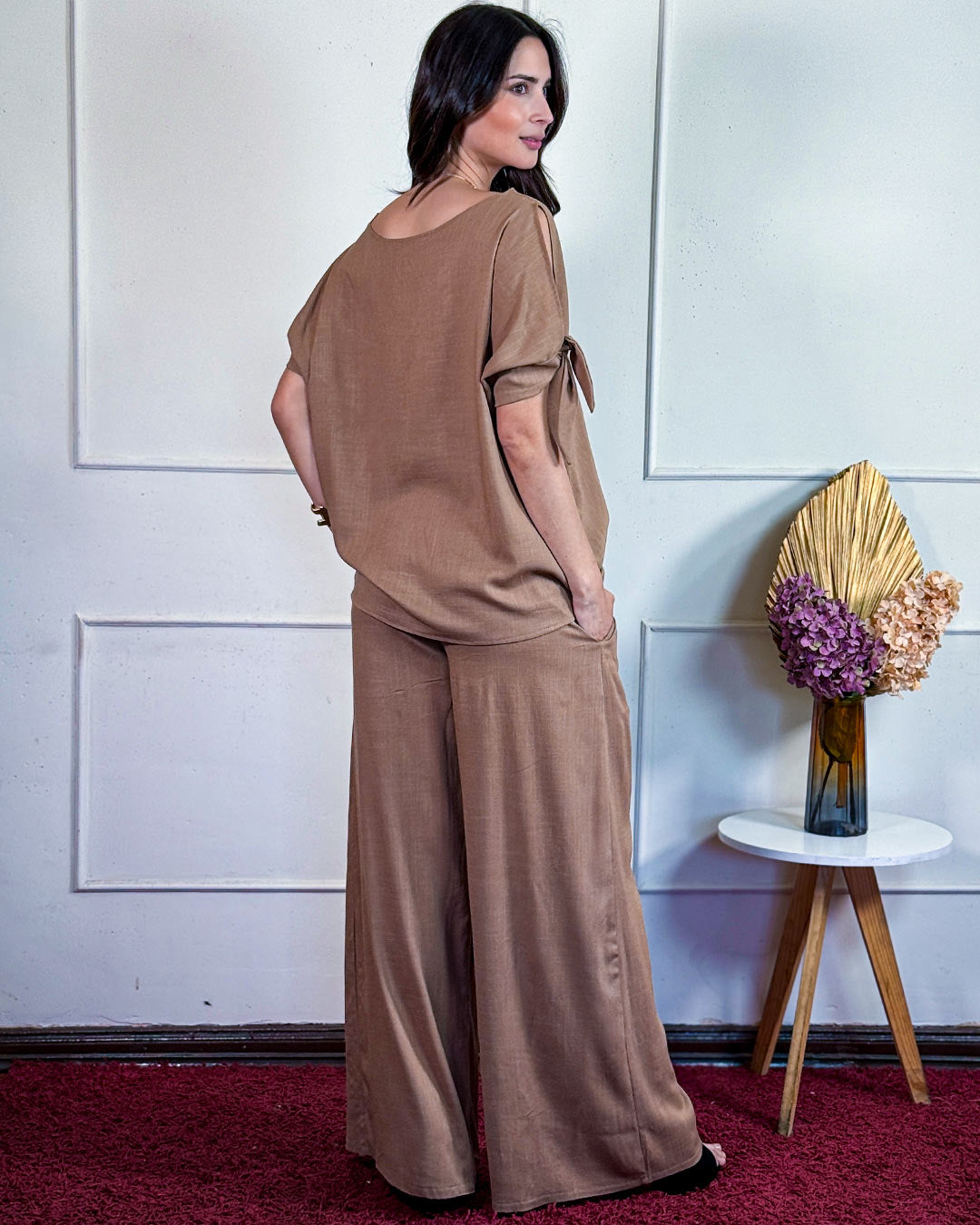 El pantalón de corte amplio aporta fluidez y sofisticación, mientras la blusa con lazo en las mangas añade un detalle sutil y femenino.